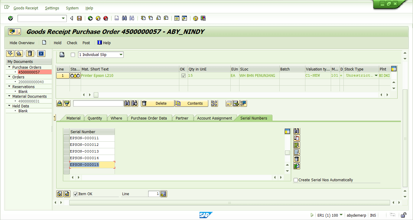 5. Goods Receipt PO . Masukkan kode serial number sesuai dengan jumlah material yang dibeli, pada tab Serial Numbers