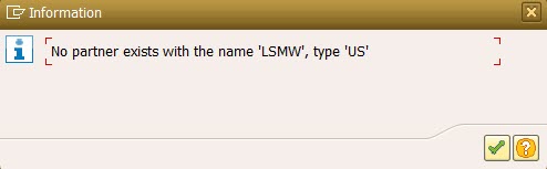 Untuk meng-upload master data characteristics kita perlu menggunakan BAPI, dikarenakan recording untuk characteristics tidak bisa dilakukan melalui LSMW. Dalam pembuatannya, ada beberapa hal yang perlu dipersiapkan sebelum melakukan proses upload data dengan LSMW seperti biasanya yang kita lakukan, yaitu data file port LSMW dan juga data partner. Jika tidak di setting terlebih dahulu, maka pada step start idoc creation akan muncul pop up information yang sifatnya error (tidak bisa berlanjut ke step selanjutnya), No Partner exists with the name ‘LSMW’ type ‘US’.