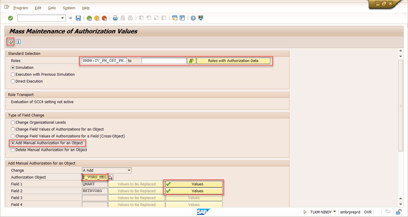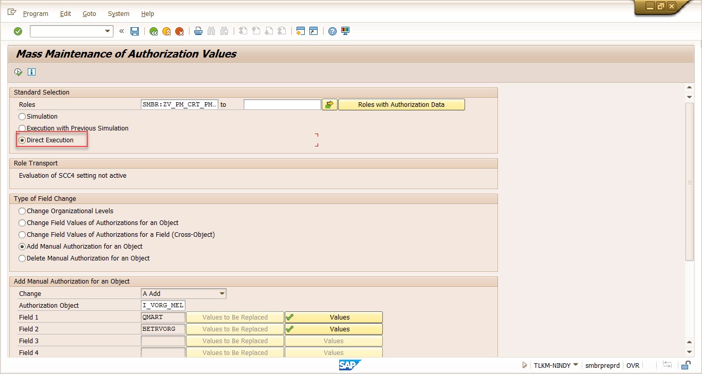 Kemudian saya butuh untuk dapat menambahkan value baru yaitu PMM4 pada BETRVORG ke sejumlah 133 role. Jika di edit satu persatu maka sangat lama. Sehingga solusi cepatnya adalah ubah secara massal melalui PFCGMASSVAL. Yang perlu di perhatikan adalah memilih type of field change secara tepat. Karena yang saya butuhkan adalah menambahkan object, maka saya memilih add manual authorization for an object