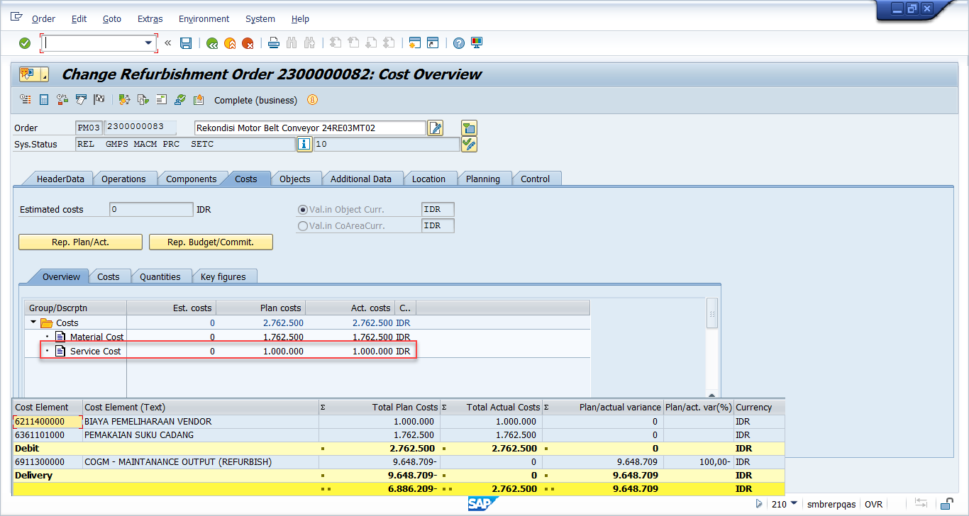 (minimal 1 rupiah, atau bisa saja nilainya nol namun akan berdampak muncul warning di Ordernya) dan biaya lain terkait kegiatan refurbishment. Apakah Labor cost nya, maupun Service Cost nya.
