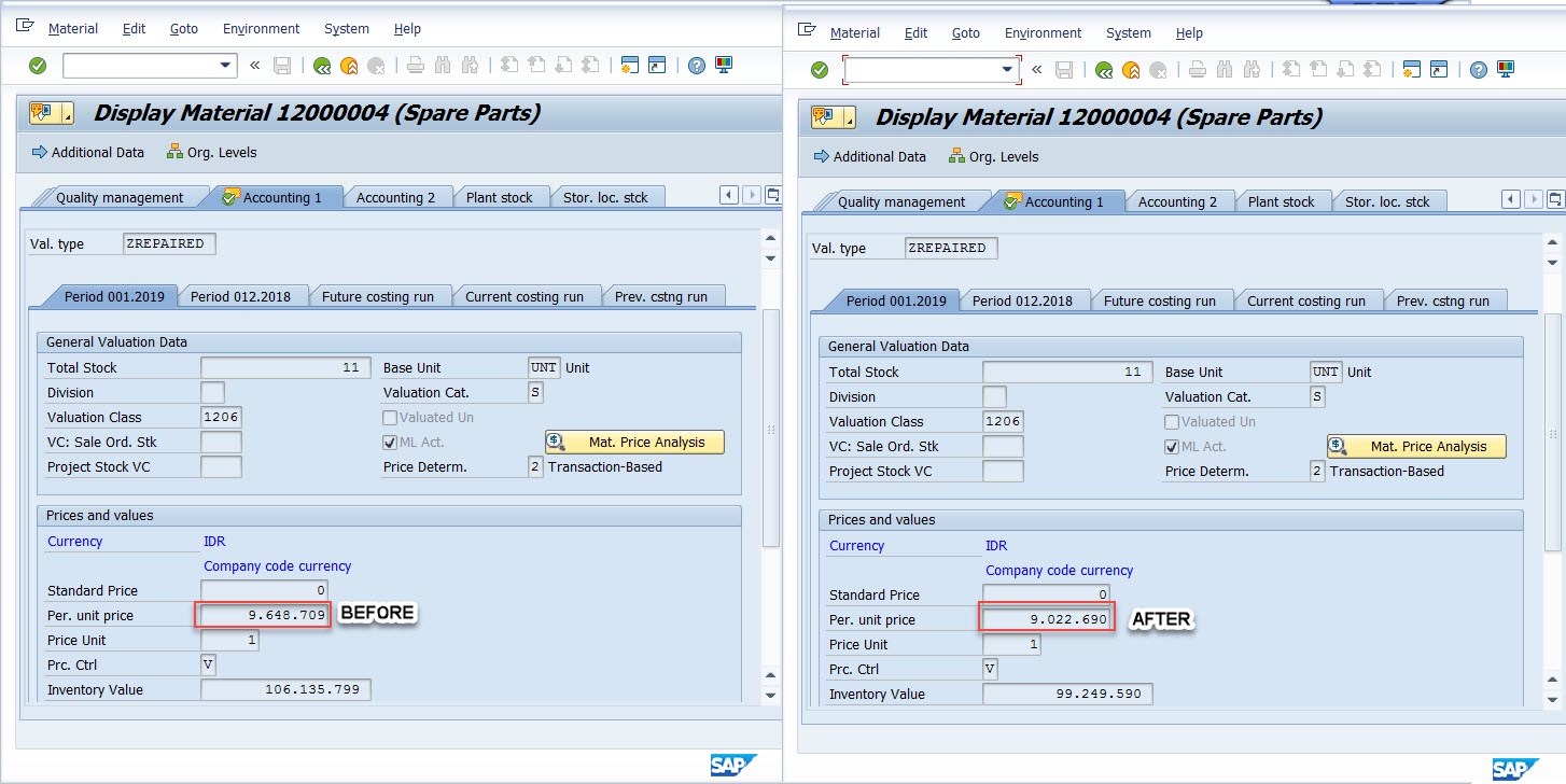 Jika kita check Stocknya, yang tadinya ada 3 Damage dan 10 Repaired, saat ini telah berubah menjadi 2 Damage dan 11 Repaired. Saat GR-Repaired, jumlah stock akan terupdate namun MAP nya material repaired belum terupdate.