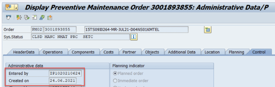 Dan berikut informasi detail ter-create-nya order pada sebuah preventive order yang tergenerate by system, bisa dilihat dari IW33 lalu pada tab Control :