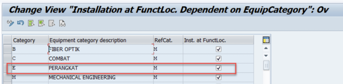 Kemudian tick Inst. at FunctLoc. pada Equipment category yang di ijinkan untuk dapat dilakukan assignment Functional Location pada Master Data Equipment