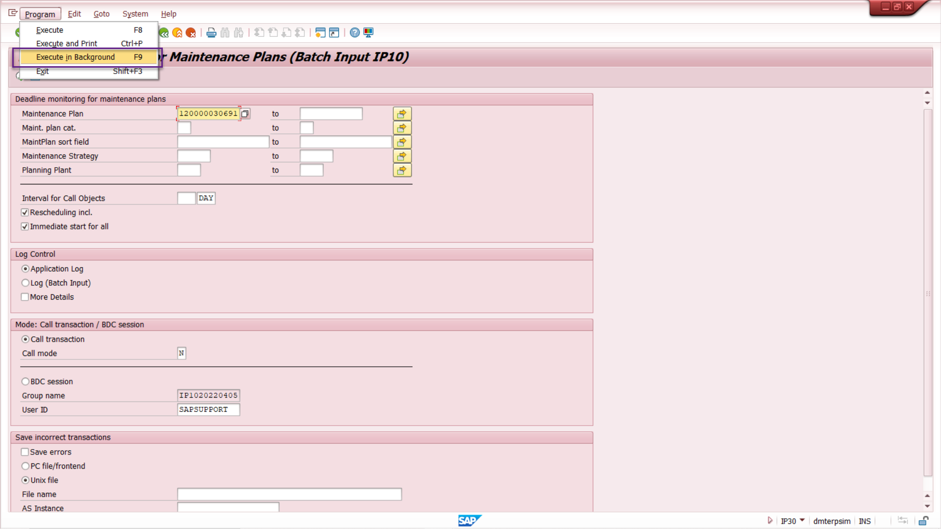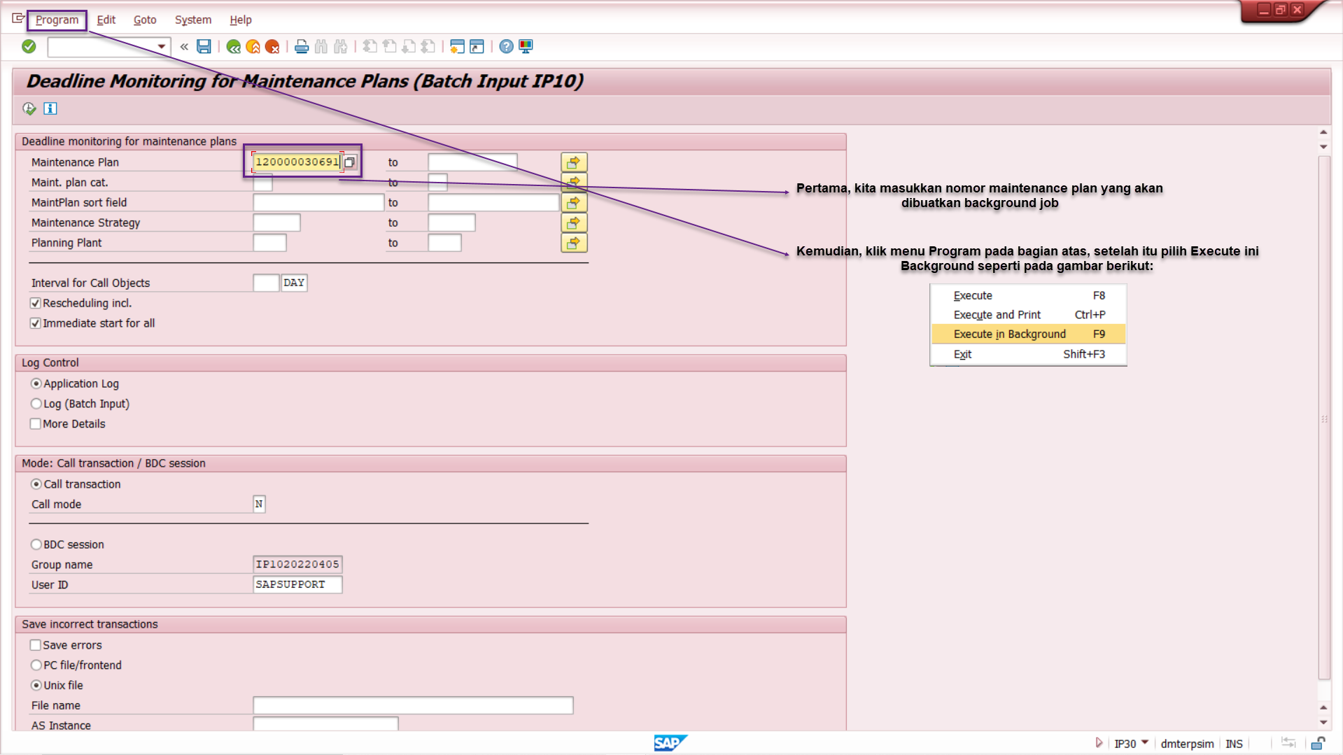 Setelah masuk ke tcode IP30, maka masukkan beberapa nomor maintenance plan yang akan dibuatkan background job seperti pada lampiran gambar berikut. Atau jika kita ingin melakukan call atas seluruh maintenance plan yang kita miliki tanpa perlu di filter, maka cukup kosongkan saja field Maintenance Plan nya.