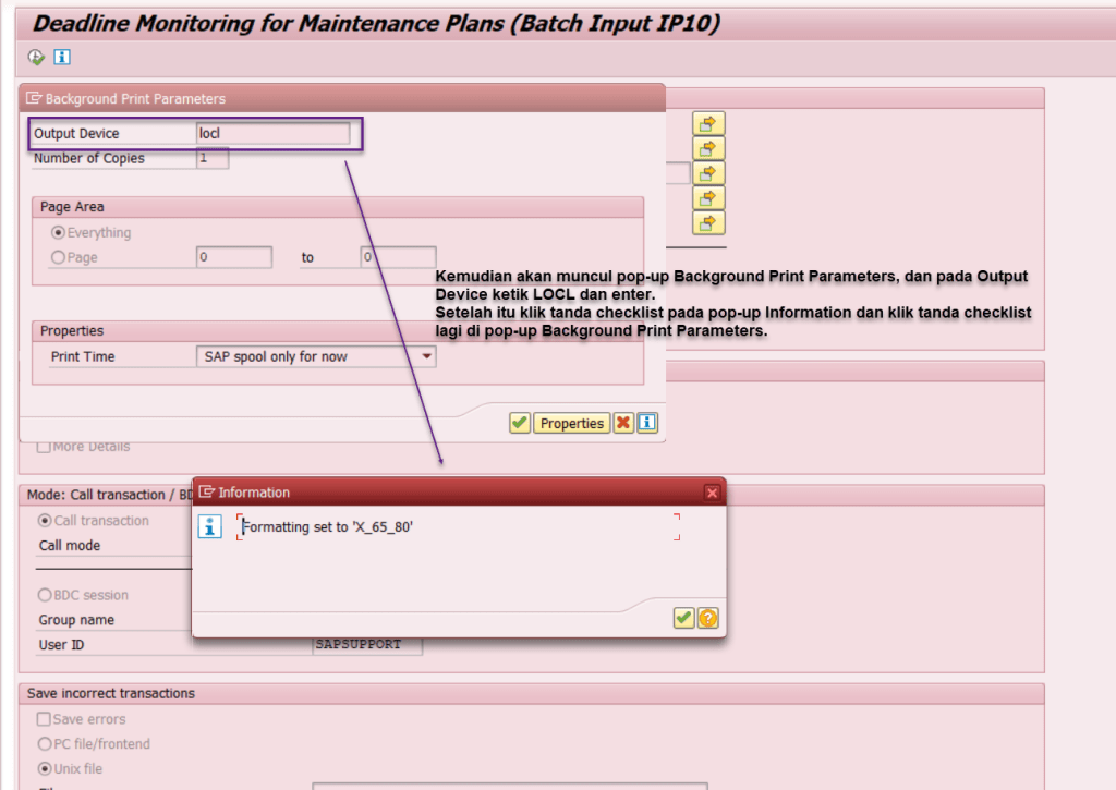 Kemudian akan muncul pop up Background Print Parameter dan pada Output Device ketik LOCL kemudian enter. Setelah itu akan muncul pop-up information, klik tanda checklist