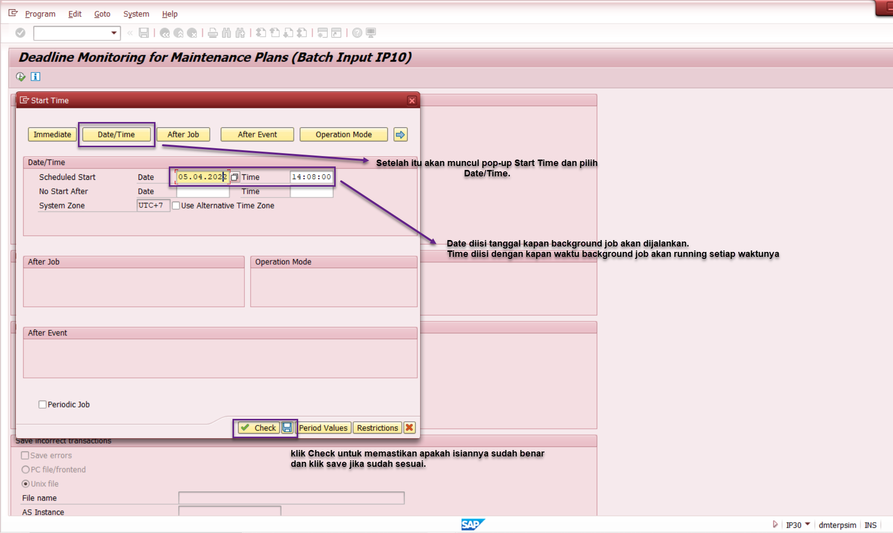 Lalu akan muncul pop up Start time. Pilih button Date/Time, lalu isi tanggal kapan background job ini akan dijalankan. Time juga perlu di isi dengan kapan waktu background job akan di running secara rutin. Jika sudah di isi, maka klik button Check untuk memastikan apakah isiannya sudah sesuai kemudian klik button Save.