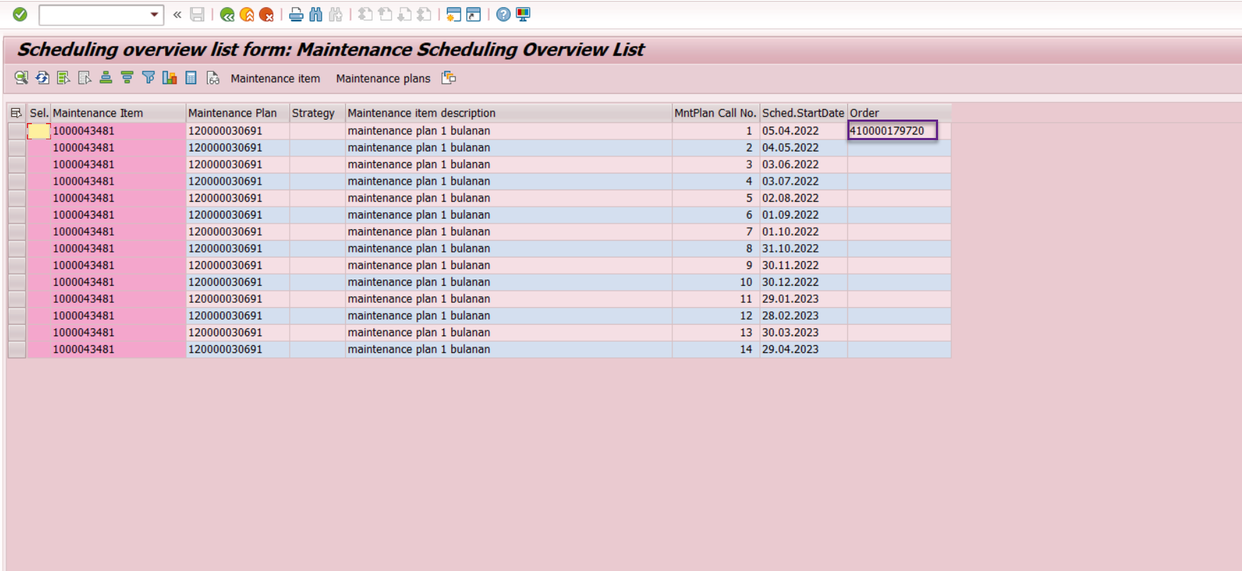 Jika sudah maka tunggu sampai background job selesai running pada jam yang ditentukan kemudian bisa cek ke IP24 untuk melihat schedule yang sudah di release oleh system dan apakah sudah ada maintenance order yang tergenerate secara otomatis.