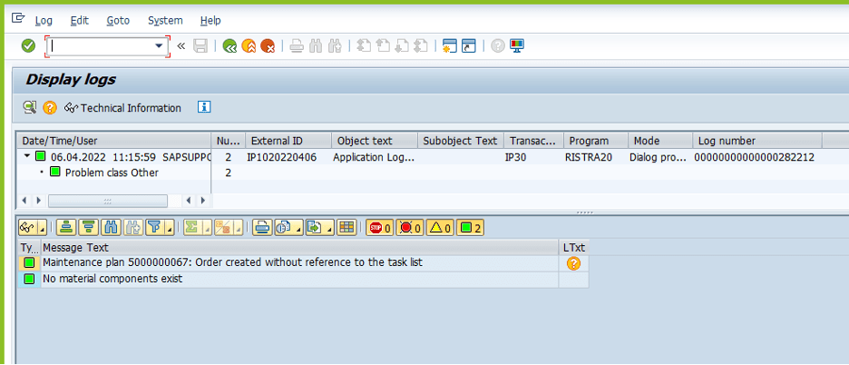 Sebagai contoh, saya mencoba melakukan running IP30. Secara normal, system tidak memunculkan warning / error pada log message nya. Namun jika kita lihat lebih detail, message yang muncul tidak memberikan informasi bahwa “order is saved and maintenance plan is schedule” (dimana secara normal seharusnya maintenance order ini akan tercreate dan muncul informasinya karena dalam testing yang saya lakukan, saya menggunakan monthly cycle dan start of cycle on 06.03.2022, sehingga seharusnya due/called di tanggal 06.04.2022, di hari saya melakukan call IP30).