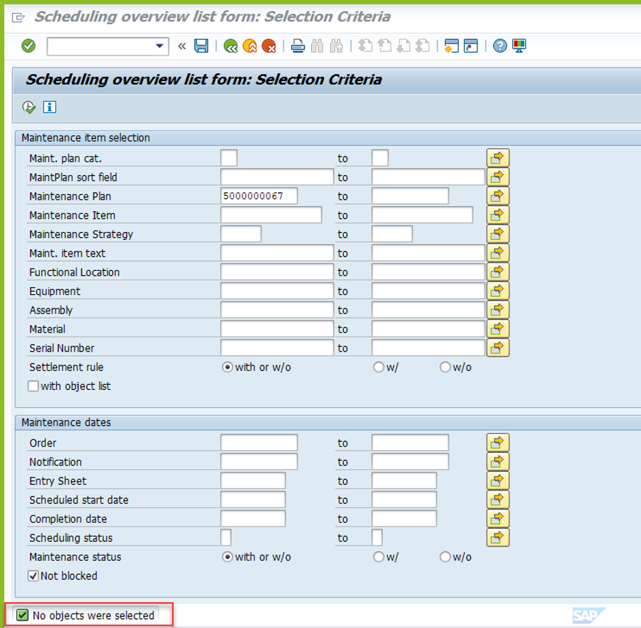 Namun setelah dilakukan pengecekan pada maintenance plan tsb, ternyata tidak muncul Scheduling overview pada IP24. Padahal proses call nya sudah di generate melalui IP30. List order yang seharusnya juga muncul di IP24, dibaca oleh system “no object we selected”