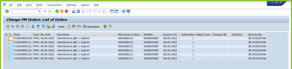 Jika kita lihat pada IW38 untuk maintenance plan tersebut, sudah tergenerate oleh system dimana indicator Entered by nya jg sudah menggunakan IP10********. Sehingga seakan akan IP30 ini sudah berhasil dilakukan.