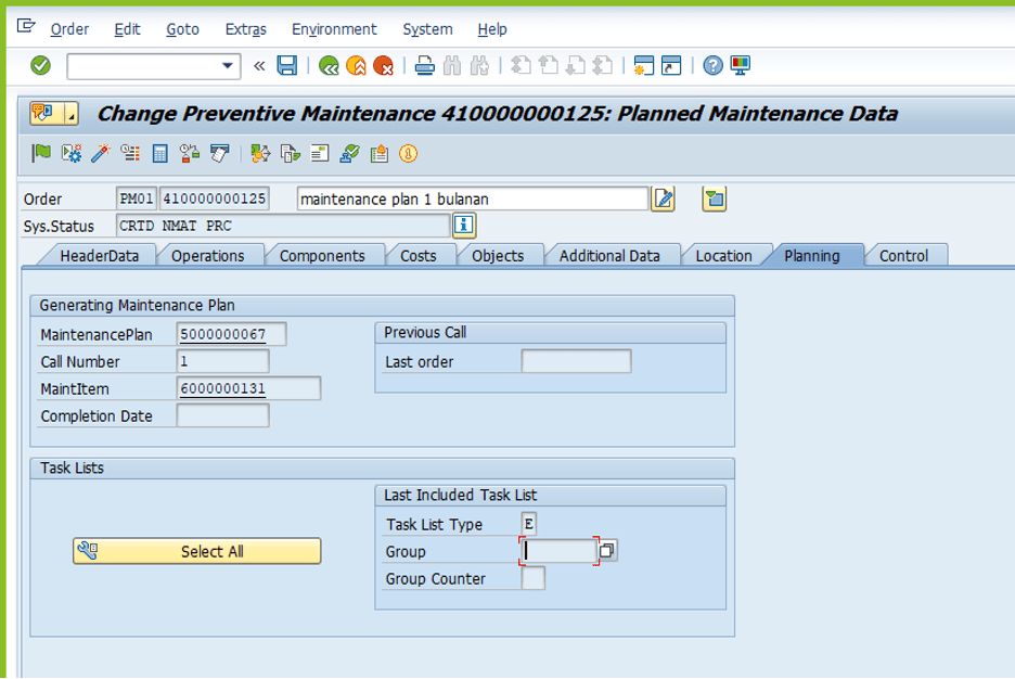 Jika kita cek lebih detail pada Maintenance Order yang tergenerate, pada tab Planning, Maintenance order ini telah memiliki call Number 1.