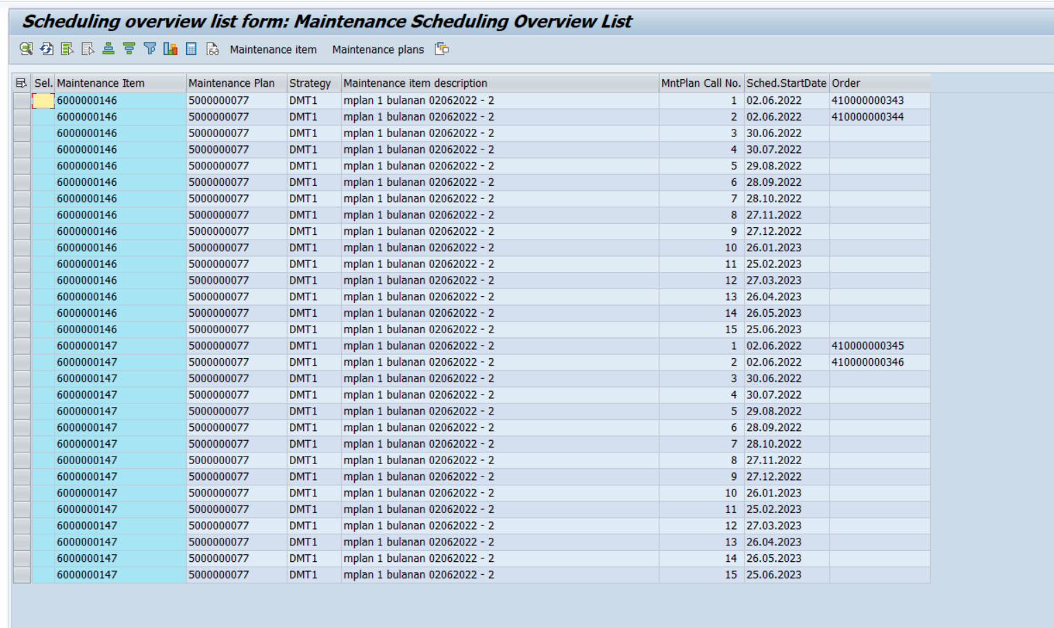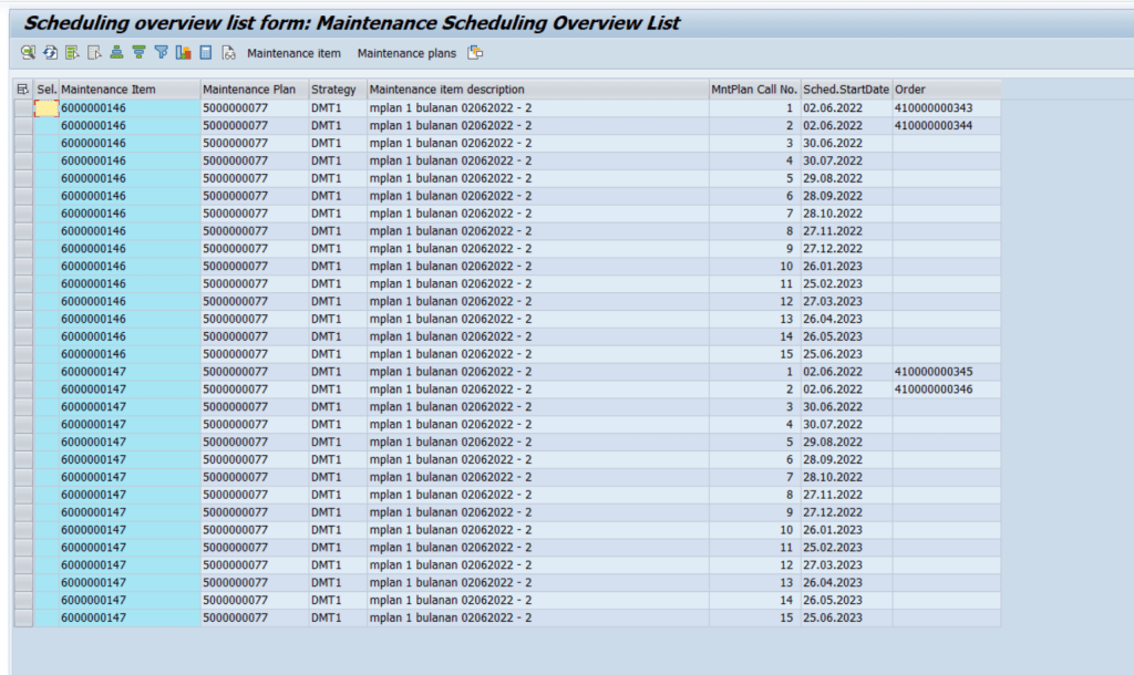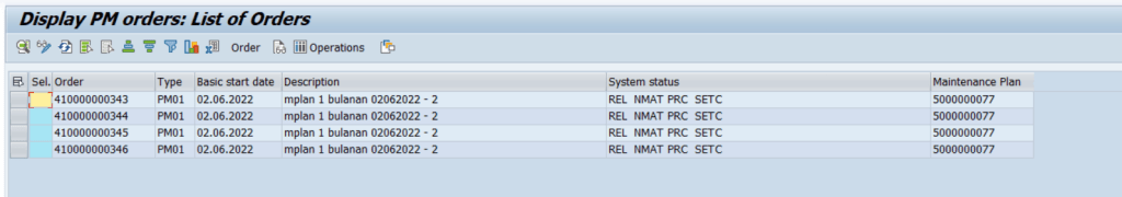Setelah dilakukan exclude, maintenance plan yang di call melalui IP30 dapat tercatat pada list schedulling IP10, sesuai dengan normal scenario of business process yang semestinya