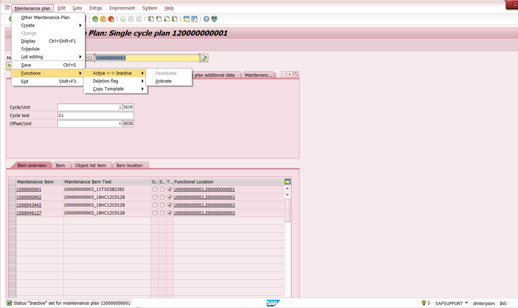 Maintenance Plan > Functions > Active – Inactive > Deactivate > Klik Save