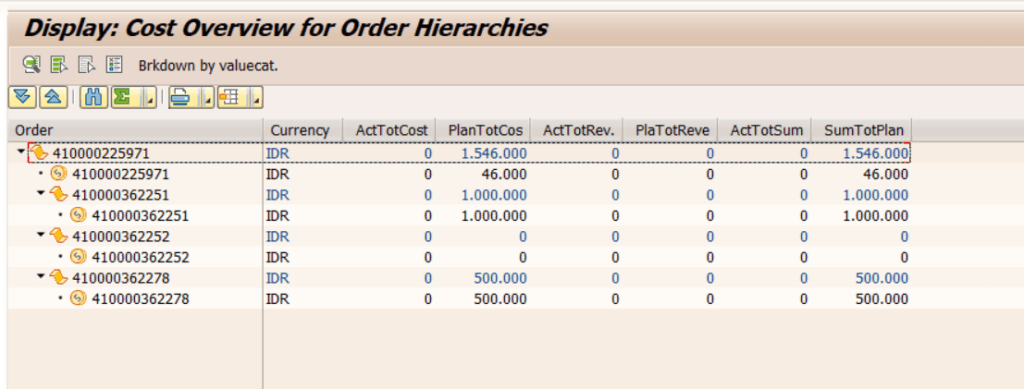 Kemudian untuk melihat Cost Overview pada Superior Order, klik Extras > Suborders > Cost Overview . Maka akan muncul total cost di seluruh order yang menjadi bagian / sub order dari 1 superior order tersebut. Hal ini dapat mempermudah dalam melakukan analisa dari sebuah pekerjaan besar yang diperlukan monitoring di sisi cost nya pada Maintenance Order.
