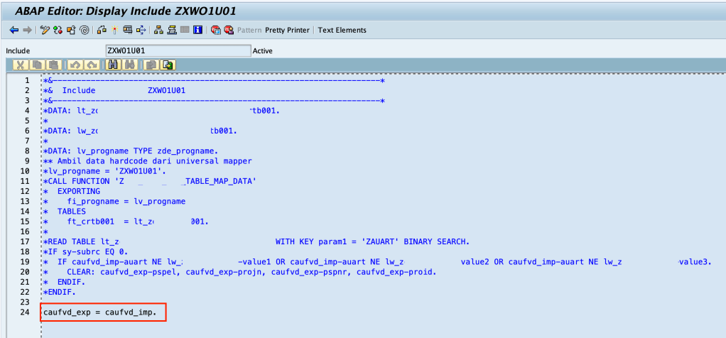 Sebagai contoh jika enhancement ini di check pada CMOD dan terbukti aktif, maka lakukan penyesuaian / resolution sesuai SAP Notes 2105907 untuk CAUFVD_EXP = CAUFVD_IMP