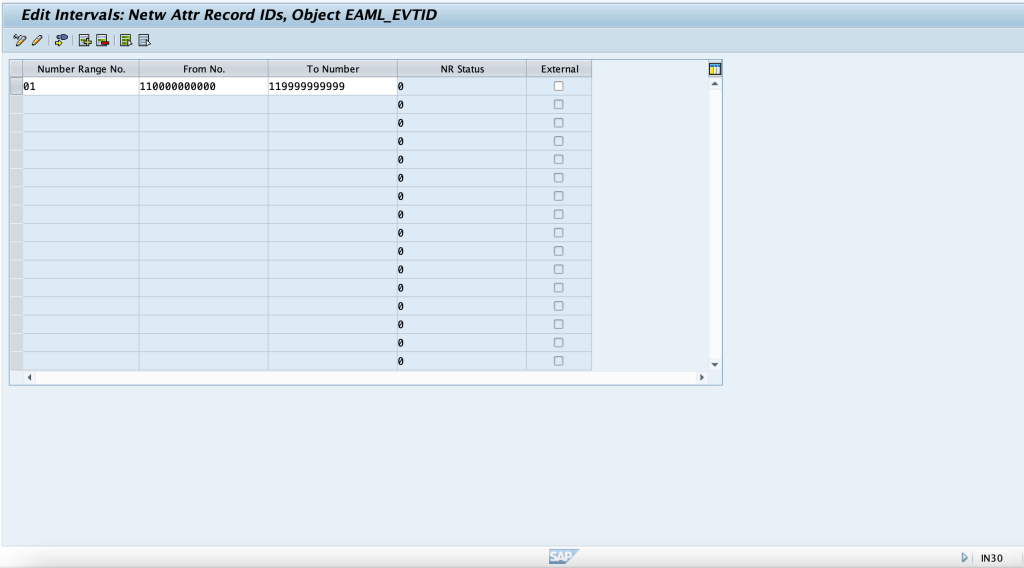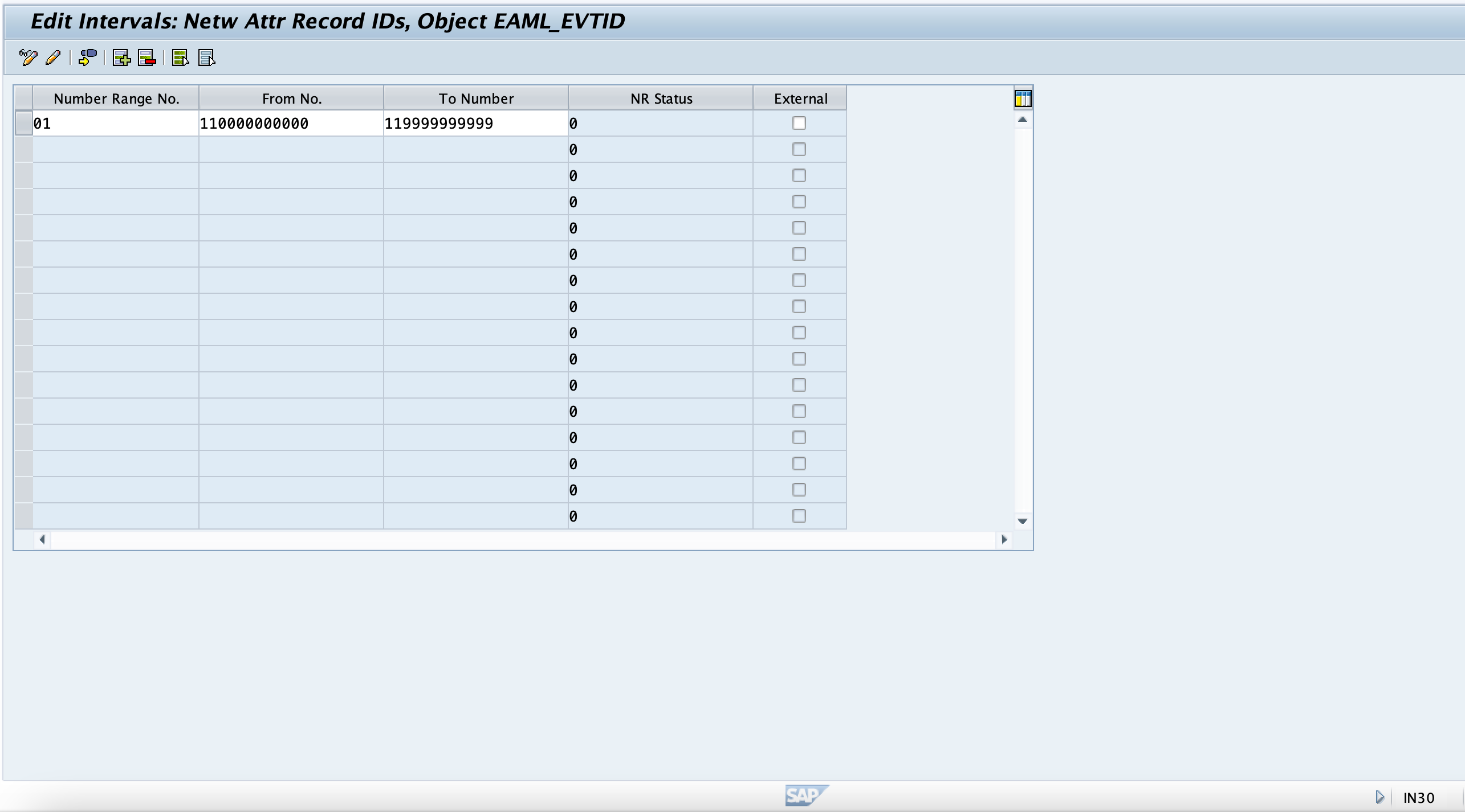 Pertama, check number ranges apakah sudah di maintain melalui SNUM. Namun anda harus memastikan mengetahui object yang perlu di maintain. Sebagai contoh pada error di atas, object yang perlu di maintain adalah object EAML_EVTID, yaitu untuk Network Attributes (IN31) pada modul LAM. Atau untuk object EAML_EVTID bisa dimaintain langsung melalui IN30. Pastikan number ranges number nya sesuai dengan interval yang direquest kan pada system. Sebagai contoh, pada error yang muncul tercantum 01 yaitu “Interval 01/to year does not exist for object EAML_EVTID”. Sehingga anda dapat memaintain 01 pada field Number Range No. Karena jika anda hanya menuliskan 1 tanpa angka 0 di depannya, maka error akan tetap terjadi. Perlu dipastikan bahwa maintain number ranges ini di maintain ditiap client nya dan tidak ditransport melalui TR.