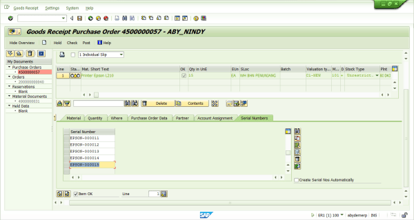 Setelah barang masuk ke gudang, maka sudah bisa di lakukan reservasi stok oleh user dan dilakukan pengeluaran barang dari gudang. Berikut adalah caranya : 1. Buat reservasi manual pakai MB21 / otomatis pakai WO di IW31, untuk mendapatkan nomor reservasi. 2. Goods issue berdasarkan nomor reservasi / nomer WO. Pilih serial number mana yang ingin di keluarkan.... Continue Reading →